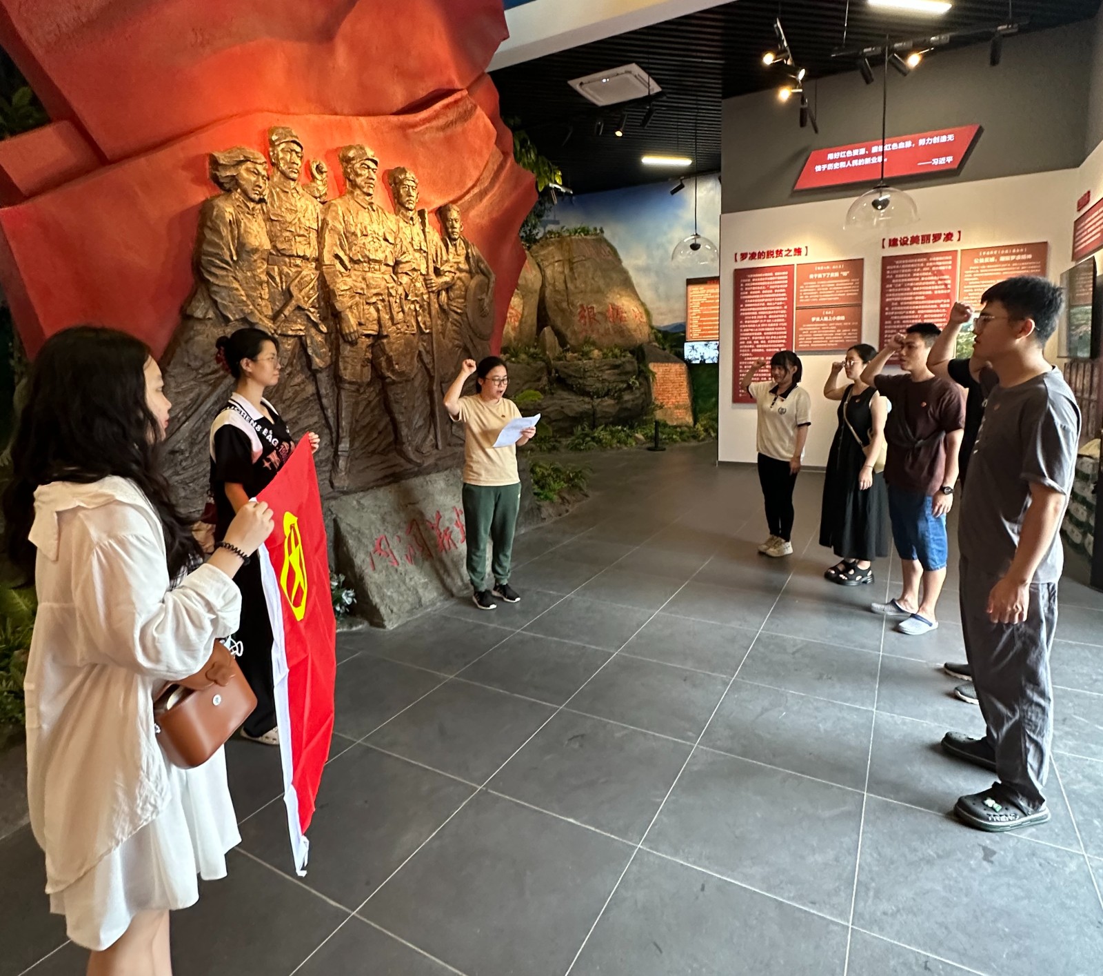 万泉镇罗凌村是琼崖革命史上著名的“内洞山会议”遗址所在地,在罗凌村史馆内,大家参观馆内展示的革命斗争史料及珍贵文物,并观看了内洞山会议的主题教育红色影片,切身地感受到当年革命先辈们艰苦奋战的壮丽诗篇。在罗凌村史馆内,青年团员们面向团旗整齐站立,在院团支副书记吴华夏的带领下重温入团誓词。