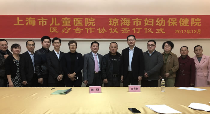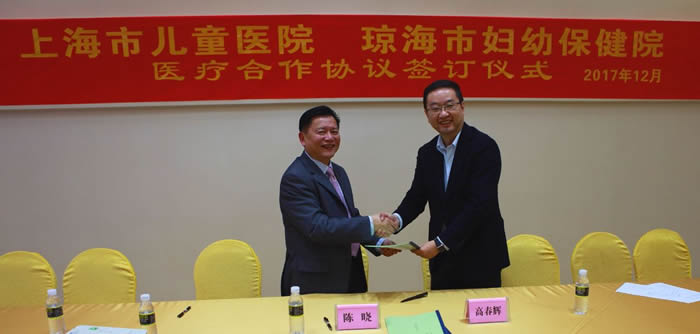 2017年12月22日,琼海市妇幼保健院与上海市儿童医院在海口签署《琼海市妇幼保健院-上海市儿童医院合作协议》。琼海市卫计委许德群副主任、琼海市妇幼保健院陈晓院长、许少珍、莫海梅副院长等一行12人在中国(海南)发展改革研究院国际学术交流中心接待了前来签约的上海市儿童医院高春辉副院长、医务科王淼副主任。经过友好磋商,双方举行了医疗帮扶合作的签约仪式。